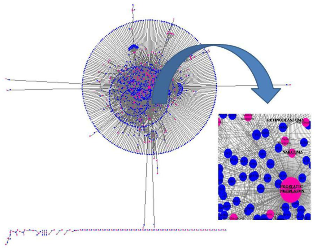 The ability to extract meaningful data from ever-expanding databases is an important area of development in computational oncology. Specifically, the relationship between genes and cancer is being documented by data-mining from large databases. In this figure, the interaction network for the markers involved in neoplasms is shown. DisGeNET [90] is a plugin for Cytoscape to query and analyze a network representation of human gene-disease databases. This figure illustrates the importance of addressing problems, such as which are the genes annotated to prostate, sarcoma or retinoblastoma neoplasms, for example, in expert-curated databases.