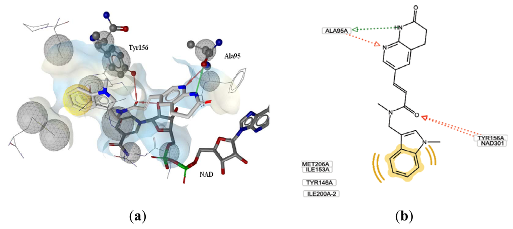 As shown in Figure 1a, the pharmacophore model automatically generated by the LigandScout 3.01 program includes five features: three hydrogen bond acceptors (HBA), one hydrogen bond donor (HBD) and one hydrophobic group. Besides, the program automatically generated a series of excluded volumes in the model. Two HBA features characterize the carbonyl group of the ligand, which forms two hydrogen bonds with Tyr156 and the 2′-hydroxyl group of the nicotinamide ribose of the nucleotide (Figure 1b). The other HBA and the HBD features are involved in H-bond interactions between alanine 95 and the pyridylamine and N-acyl hydrogen of the naphthyridinone functionality, respectively. The hydrophobic feature is located on the indole portion.