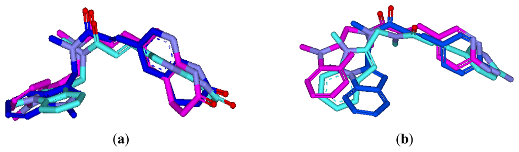 The best pharmacophore mapping conformation (purple stick) and the docking conformation with the highest ChemScore (cyan stick) are superimposed on the bound conformation in the crystal structure (blue stick). (a) For compound 20; (b) for compound 9.
