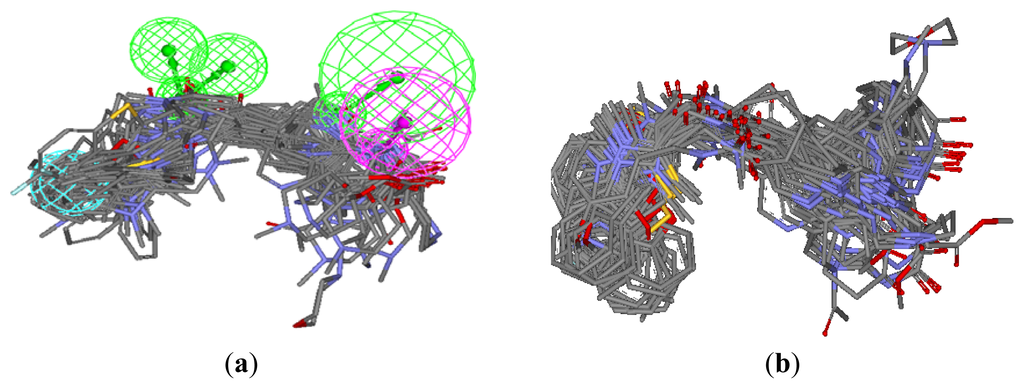 In the 3D-QSAR studies, the molecular alignment and conformation determination are very important to construct reliable models. Due to the flexibility of the investigated compounds, it is difficult to choose a suitable conformation that achieves a meaningful superimposition. In an ideal alignment the biologically active conformations should be aligned taking into account the orientations that the ligands adopt at the binding site of the protein. Therefore, we applied two different receptor-based alignments, with the conformations obtained from structure-based pharmacophore (SBP) search and docking.