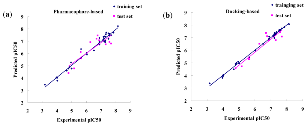 Graph of experimental values versus predicted values for training and test set compounds from CoMSIA-SEHD model. (a) For pharmacophore-based alignment, (b) for docking-based alignment.