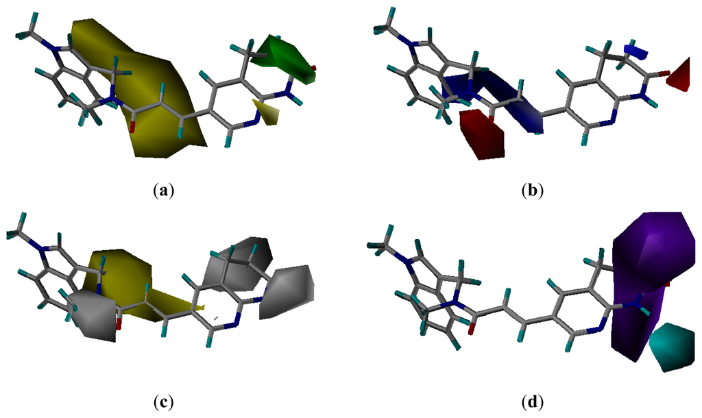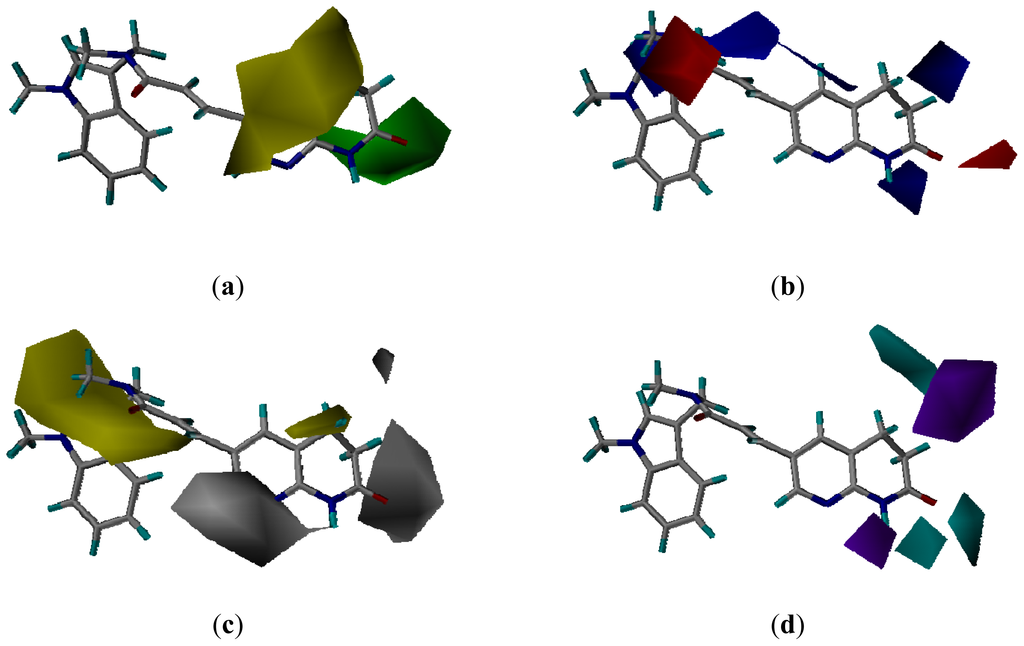 The hydrogen bond donor contour plot is displayed in Figure 5d. The cyan contours represent the region favoring hydrogen bond donor substituents. The purple contours indicate that hydrogen bond acceptor groups in these regions are required for higher activity. It can be explained by the fact that the hydrogen bonds were involved in the naphthyridinone functionality and enzyme FabI. That was why compounds 1–16 without naphthyridinone were less potent compared to compounds 19–24, etc. For compounds 17 and 18, acylated amino pyridine was less favored compared to the hydrogen bond of naphthyridinone.