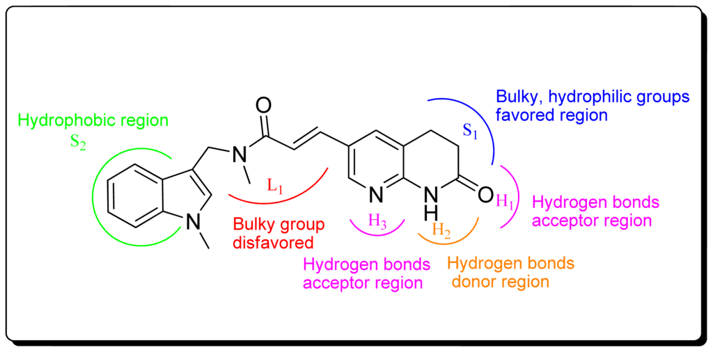 Comparing the 3D-QSAR models, the improved performance of the CoMSIA is obvious, while the differences in the case of CoMFA are negligible. The results of 3D-QSAR CoMSIA obtained from both alignments are complimentary to each other. The detailed contour analysis of both CoMSIA models enabled us to point out several structural requirements as mentioned in the above discussion for the observed inhibitory activities (Figure 7). In detail, the bulky and hydrophilic groups at the S1 region are favorable, while the hydrophobic groups at the S2 region are favorable. The hydrogen bond acceptor group at the H1 and H3 position may benefit the potency. The hydrogen bond donor group at the H2 position increases the activity. The ene-formamide skeleton was essential for high activity.