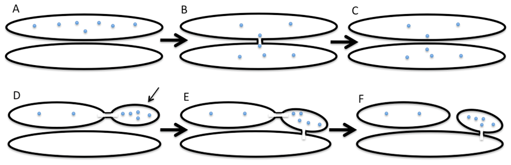 Two variants of the kiss-and-run model. Upper panel: the symmetric kiss-and-run model. Lower panel: the asymmetric kiss-and-run model. (A) Molecules of a cargo (blue dots) are present in the upper cisterna; (B) Fusion between two cisternae and diffusion of cargo to the lower cisterna; (C) Fission of the connection between two cisternae. Now, part of cargo molecules is in the lower cisterna; (D) Molecules of a cargo are partially concentrated in a domain (thin arrow) of the upper cisterna. The domain is connected with the cisternae by thin tubule; (E) Fusion between the right domain and the lower cisterna; (F) Fission of the tubule connecting the upper cisterna and the domain. Now, the domain belongs to the lower cisterna being connected with it and separated from the upper cisterna.