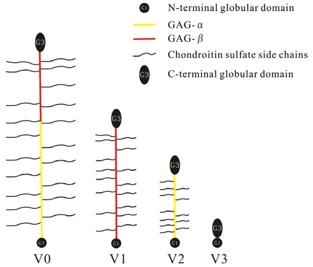 Versican, a ubiquitous component of the ECM, is highly expressed by proliferating cells and mesenchyme during tissue remodeling and embryonic morphogenesis [–]. Structurally, versican consists of an N-terminal globular domain (G1), a C-terminal globular domain (G3), and chondroitin sulfate (CS) chain-binding regions (GAG-α, GAG-β) between the G1 and G3 domains []. Alternative splicing generates at least four isoforms of versican, known as V0, V1, V2, and V3 [] (Figure 1). V0 contains both GAG-α and GAG-β; V1 and V2 possess only GAG-β and GAG-α, respectively; and V3 solely has the globular domains. Versican isoforms V0/V1 are mainly expressed in the late stage of embryonic development [], whereas versican V2 is one of the main constituents of the mature CNS ECM [].