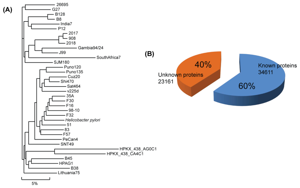 Genome sequence and proteins of H. pylori. In the phylogenetic tree, a total of 36 sub-species are branched with a total of about 60,000 genes (A); and among the translated proteins, the biological functions of 40% of the proteins are unidentified (B).
