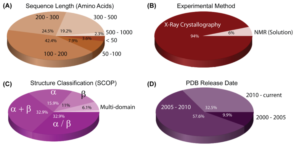 Statistics of protein structures from H. pylori. All data were collected and processed from PDB on 14 February 2012 [52]. The dominant properties of the presented data are 100–300 kDa in size, X-ray diffraction as the experimental method, alpha and beta structural motifs, and release date from 2005–2010.