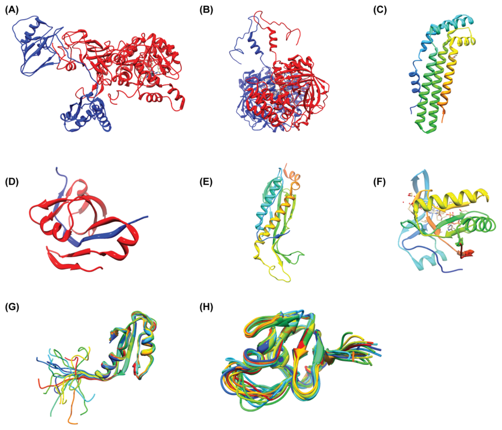 Several 3D structures from H. pylori. Urease subunit α and β (A, pdb code: 1E9Y), Kat catalase (B, pdb code: 1WQL) are multiple domain structures with multiple chains. Aspartate 1-decarboxylase adopts a dominant β structure (D, pdb code: 1UHD). The structures of unknown proteins are shown with different variations of their structural domains (C, pdb code 1S2X, all α; E, pdb code: 2I9I, α/β; F, pdb code: 2ATZ, α + β; G, pdb code: 2H9Z, α + β; H, pdb code: 2K6P, RNA binding motif). Structures of G and H are solved by NMR. All structures were displayed using UCSF Chimera with ribbon presentation method [55].