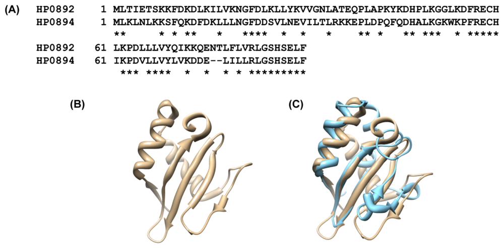 Comparison between HP0892 and HP0894. (A) Sequence homology between HP0892 and HP0894. Stars represent identical residues (53.3% identity in 90 residues); (B) Ribbon drawing of the representative conformer of HP0892 (PDB ID:2OTR); (C) Superposition of HP0892 (tan) and HP0894 (sky blue). The pairwise RMSD between two proteins was 0.712 Å. The topology of the two molecules is slightly different, especially in the loop regions.