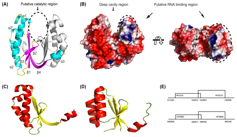 Structure of HP0315 from H. pylori. (A) Cartoon representation of the dimer of HP0315 (α-helices, β-strands and loops are cyan, magenta and yellow, respectively). Dotted circle represents the putative catalytic region located at the deep cavity region. (B) Surface representation of HP0315 showing positive and negative electrostatic potential in blue and red, respectively. The dotted circle represents the putative RNA-binding region. This region would be related to initial binding with RNA, and then a second catalytic reaction would occur around the deep cavity region. (C,D) Structural comparison between HP0315 (C); and the homologue, SSO1404 (PDB code:2ivy) (D). β-Strands are colored in “yellow” and α-helices in “red”. Both of the structures possess a ferredoxin-like fold. (E) Diagrams of the hp0315 (hp0894) and hp0316 (hp0895) encoding region from the chromosome of H. pylori.