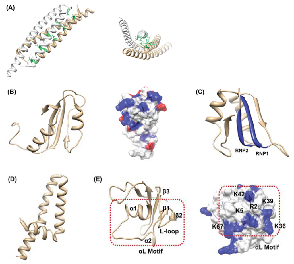 (A) Ribbon diagram of the HP0062 dimer is shown. Side and top views of the HP0062, showing the leucine zipper (green); (B) Ribbon drawing of the representative conformer of HP0495. Distribution of the surface charges on two distinct faces of HP0495 is shown. Positively-charged residues are blue, negatively-charged residues are red; (C) Ribbon drawing of the representative conformer of HP0827. Blue colors represent conserved RNP motifs lying side by side; (D) Ribbon drawing of the representative conformer of HP1242; (E) Ribbon drawing of the representative conformer of HP1423. The αL motif consists of two α-helices and the loop between β2 and β3. Electrostatic potential surface diagrams of HP1423 shows a strong concentration of positive charge in the proposed RNA-binding αL motif facing outwards.