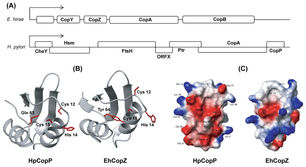 Copper metabolism by copper chaperones has been studied extensively in both eukaryotes and bacteria. In the gram-positive bacterium, Enterococcus hirae, the cop operon is composed of four proteins: two integral membrane P-type ATPases, CopA, and CopB which transport Cu(I) into cells under Cu(I) limiting conditions and eliminate Cu(I) under conditions of high Cu(I) levels, respectively [103,104]. The imported copper ions are transferred from CopA to the CopZ chaperone [105–107] and CopY, a gene repressor, is released from the cop operon promoter when Cu(I) is delivered to CopY by the copper chaperone, CopZ (Figure 8A). In the case of the gram-negative bacterium, H. pylori, copper homeostasis seems to be maintained by only two proteins CopA and CopP (HP1073). The H. pylori cop operon (Figure 8A) is included in a novel stress-responsive operon (sro), which encodes the flagellar motor switch protein CheY, the putative methyltransferase Hsm, the cell division protein FtsH, the putative phosphatidyltransferase Ptr, the heavy metal-binding proteins CopA and CopP, and an open reading frame of unknown function [108]. CopA is a member of the bacterial copper ion ATPase family, and CopP, which is homologous to E. hirae CopZ, is a putative copper binding regulatory protein of 66 amino acids [104,108]. CopA of H. pylori was identified as a Cu(II) export ATPase [109], which shows that its biological role is more similar to that of E. hirae CopB, rather than CopA [110]. Moreover, the CopP gene resides immediately downstream of the CopA gene, while the E. hirae CopZ gene resides upstream of the CopA gene. Therefore, the cop operon organization seems to be evolutionarily modified in each bacterium.