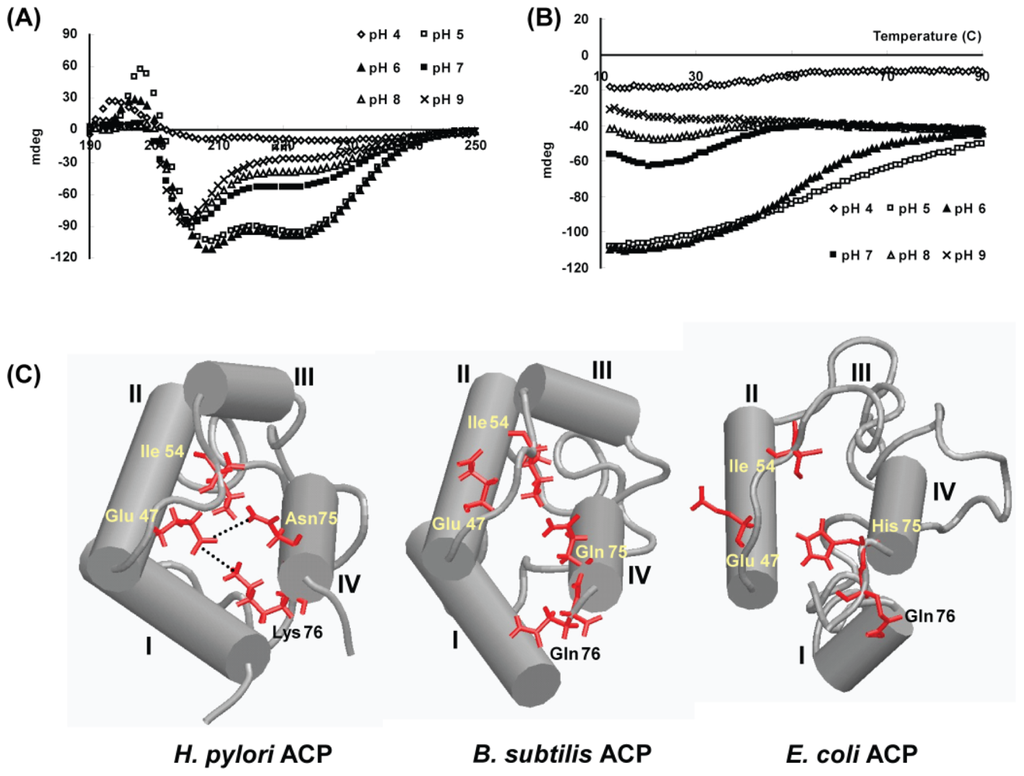 Comparison of the H. pylori ACP structure with the B. subtilis ACP and E. coli ACP structures. (A) CD spectra of HpACP recorded at various pHs. At neutral and alkaline pH, the conformational transition of HpACP occurred; (B) Tm curves of HpACP. At acidic pH 6, the temperature curves of the HpACP showed a distinct melting temperature around 50 °C. The unfolding process above neutral pH proceeded through multi-phasic changes, showing at least three stages exist; (C) Schematic representation showing the buried hydrophilic residues Glu 47, Asn 75 and Lys 76 in the energy minimized average structure of HpACP. Putative hydrogen-bonding interactions are indicated by dotted lines. The corresponding residues are compared to those of B. subtilis ACP and E. coli ACP.