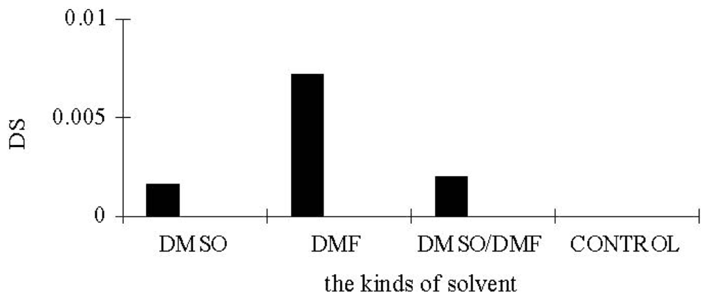 According to the different esterifications of starch with palmitic acid under micro-solvent systems by using DMSO, DMF or the mixture of DMSO and DMF (1:1, v:v) as co-solvent, the micro-solvent system was found to be an effective esterification system for lipase-catalyzed esterifications of starch with palmitic acid. Esterification of native starch with palmitic acid under the micro-solvent system, with DMF as co-solvent, showed an ester peak in the region 1735 cm−1 in the IR spectrum (Figure 1). A DS of 0.0072 was obtained in an incubation time of 7 h at 65 °C. Almost no ester peak could be detected in the IR spectrum when using DMSO or the mixture of DMSO and DMF for esterification of starch with palmitic acid. As shown in Figure 2, very common starch solvent DMSO or the mixture of DMSO and DMF gives a worse result when compared to DMF. In all cases, DMF used as a co-solvent gives better reaction effectiveness. The effects of reaction temperature and time on the DS of starch palmitate were investigated. The results (Figures 3,4) showed that the DS of the starch palmitate is temperature and time dependent. The esterification of pretreatment starch with palmitic acid could not be realized under the same conditions regardless of what kind of solvent was used as co-solvent. That may be because the volume expansion of pretreatment starch granules created a situation in which made the micro-solvent could not achieve the role of co-solvent.