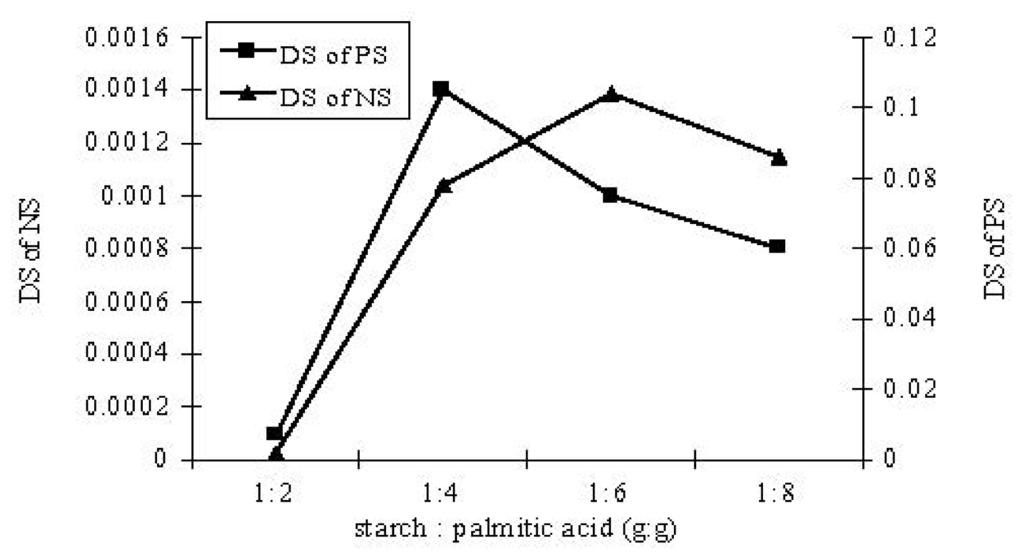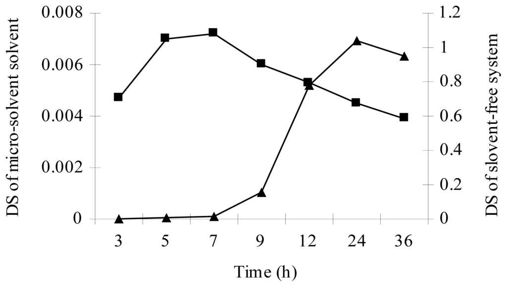 A number of preliminary experiments were carried out to investigate whether the lipase catalyzed esterification of starch with palmitic acid is indeed feasible in the solvent-free system. The exploratory experiments were performed with lipase Novozym 435 as the catalyst at different substrate ratios and temperatures for 3–24 h. At the end of reaction, the product was soaked in 95% ethanol for 10 min and washed thoroughly with 60 °C methanol to remove un-reacted palmitic acid and dried (50 °C) until constant weight was achieved. The immobilized lipase was removed with 80 screen mesh. Esterification of native starch with palmitic acid under the solvent-free system at reaction conditions (starch:palmitic acid = 1:6, g:g; 70 °C for 24 h) gave an esterification product with a DS of 0.0014. But, the DS of the esterification product was high (to 1.04) after the starch was pretreated using NaOH/Urea/H2O (Figure 5). The DS of starch palmitate was very low and could not even be detected when the reaction temperature was at 55 °C or 60 °C. This is mainly because the palmitic acid could not melt at temperature below its melting point, so that the mass transfer between all of the substrates was badly hindered.