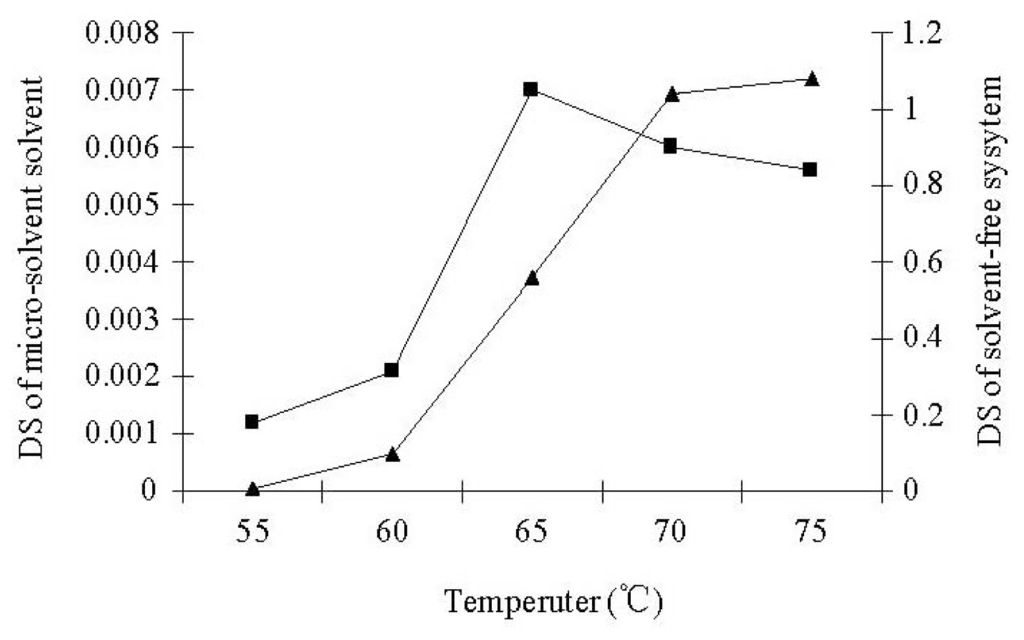 Temperature effect in DS of starch palmitate synthesized under micro-solvent solvent (■) and solvent-free system (▲).