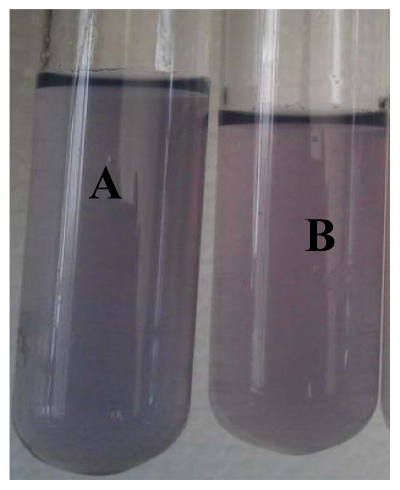 The iodine adsorption color reaction of native starch presented blue (A), however starch palmitate presented blue purple (B), as shown in Figure 7. The absorbance of starch palmitate (2.495 abs) is lower than native starch (1.413 abs) especially in the maximum absorption wavelength. The maximum absorption wavelength moved to a higher wavelength (from 211 nm to 255 nm) after esterification of starch. The ultraviolet wavelength scan (from 190 nm to 450 nm) results provided preliminary confirmation that the palmitic acid had been introduced into the starch chain.