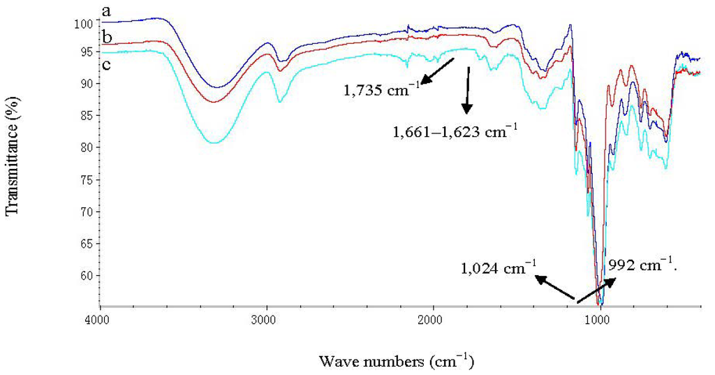 In the native starch (NS) spectrum, the characteristic peaks (954–1184 cm−1) are attributed to C–OH bond stretching. Another strong broad band, due to hydroxyl bond stretching, appears at 3000–3600 cm−1 (Figure 8a,b), which is reduced on starch palmitate (SP), Figure 8c. A characteristic peak C=O bond stretching, present in the starch, occurred at 1661–1623 cm−1, which intensified on the pretreatment starch (PS) (Figure 8a,b). That demonstrated the molecular chain of starch had fractured after pretreatment [18]. A strong absorption band at 992 cm−1, which appears at 1024 cm−1, probably due to the stretching of the C–O–C bond, was present in the spectra of the starch, consistent with the earlier report by Zhao [19]. The red shift of C–O–C bond stretching could weaken the hydrogen bonding. An extremely broad band due to hydrogen bonded hydroxyl groups (O–H) appeared at 3400 cm−1 which was attributed to the complex vibrational stretches associated with free, inter- and intra- molecular bound hydroxyl groups that make up the gross structure of starch [20]. The band at 2919 cm−1 is characteristic of C–H stretches. These spectra have similar profiles. The differences between NS and PN were the C=O bond stretching and the red shift of C–O–C bond stretching. There was no new peak present.