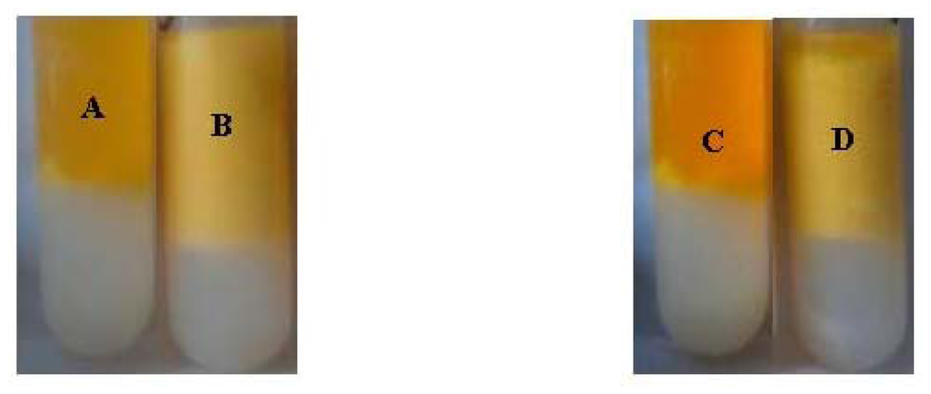 Emulsions contained soybean oil (25 mL). The aqueous phase contained 0.5 g starch or starch palmitate. Oil in water emulsions were prepared by first gelatinization of 0.5 g starch or starch palmitate in 25 mL deionized water on a bath of boiling water for 15 min, followed by mixing the oil into the cold starch or starch palmitate paste using a superfine homogenizer FA25 (Fluko Equipment Shanghai Co., China) at 10,000 r/min for 3 min and the emulsion formed. The emulsion was centrifuged at 3000 r/min for 15 min and the height of the emulsion layer was measured, and the total height of liquid. The centrifugation was repeated after 24 h. The emulsifying capacity (EC) and the emulsion stability (ES) were calculated as follows according to the method of Bai [6] (Equations (2) and (3)):