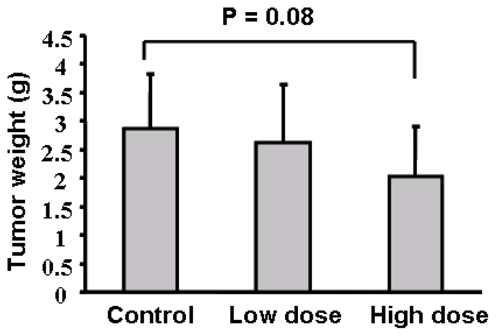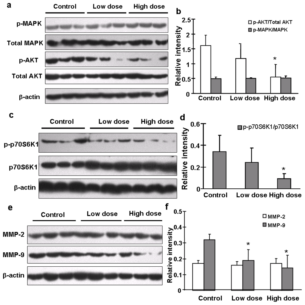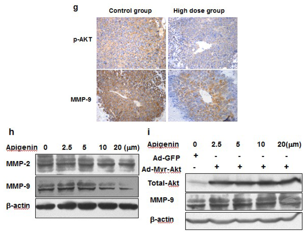 Chicago/Turabian StyleHe, Jun, Qing Xu, Min Wang, Chongyong Li, Xu Qian, Zhumei Shi, Ling-Zhi Liu, and Bing-Hua Jiang. 2012. "Oral Administration of Apigenin Inhibits Metastasis through AKT/P70S6K1/MMP-9 Pathway in Orthotopic Ovarian Tumor Model" International Journal of Molecular Sciences 13, no. 6: 7271-7282. https://doi.org/10.3390/ijms13067271
