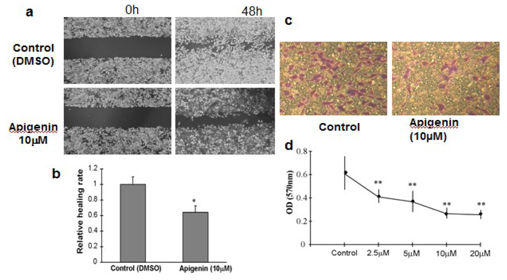- Lee, W.J.; Chen, W.K.; Wang, C.J.; Lin, W.L.; Tseng, T.H. Apigenin inhibits HGF-promoted invasive growth and metastasis involving blocking PI3K/AKT pathway and β4 integrin function in MDA-MB-231 breast cancer cells. Toxicol. Appl. Pharmacol 2008, 226, 178–191. [Google Scholar]