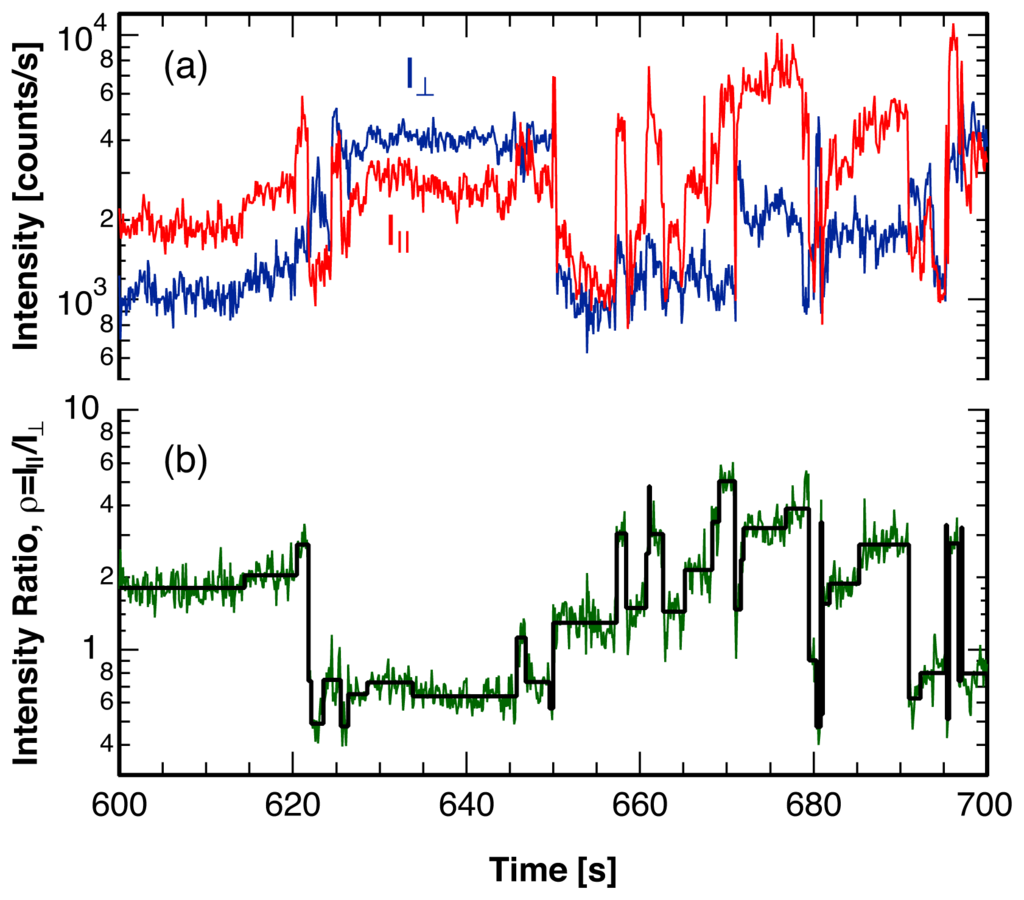 Here, effects of the photodynamics of the probe molecule, which might change the total intensity, I||+ I⊥ without affecting the intensity ratio, I||/I⊥, are eliminated from the monitored quantity, Id, and only changes in the polarization direction of the emission, caused by single molecule reorientation, are recorded. It would be desirable to detect sudden changes in the ratiometric measure similar to their detection in the single-channel analysis methods discussed above. A two-state Markov-chain approach has for example been used to analyze sp-FRET experiments [44,46].