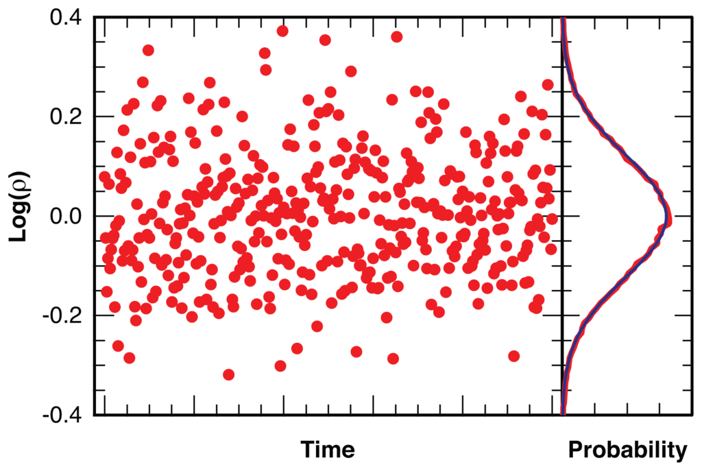Distribution of the logarithm of the intensity ratio, ρ = I||/I⊥, for a simulated photon arrival trajectory, binned with ⟨Nphoton⟩ = 25 photons per bin (red), with fit to a Gaussian distribution (blue).