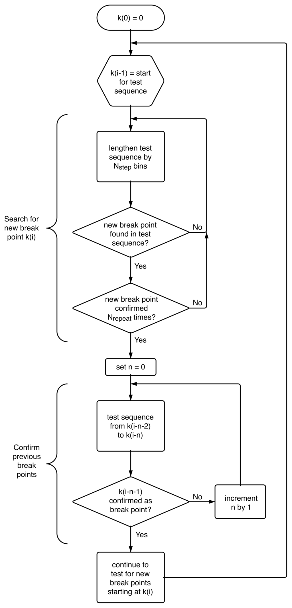 Schematic representation of the algorithm employed to systematically identify a sequence of most likely break points in an experimental trajectory in a self-consistent manner.