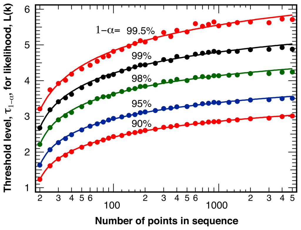 At every point, k′, with k′ = 0. . . L, in these intensity ratio sequences we determine the Student’s t-test’s p-value using standard statistical procedures [53] to test for statistical differences between the sequences before and after the trial point k′, {0, . . ., k′− 1} and {k′, . . ., L}, as if k′ were an actual break point in the intensity ratio sequence. As the sequences simulated to test for false positives do not contain an actual break point, we save the maximum p-value, pmax, found in each of the N trials of a given length, L. We exclude the p-values for the first and last Nexcl = 10 potential break points, as those show very large fluctuations due to the small size of one of the two sections tested (Section 2.1). For each length, L, we find a threshold value τ1−α, such that for a fraction 1−α of the N trials the maximum p-value, pmax, falls below the threshold τ1−α, where 1 − α is the level of confidence.