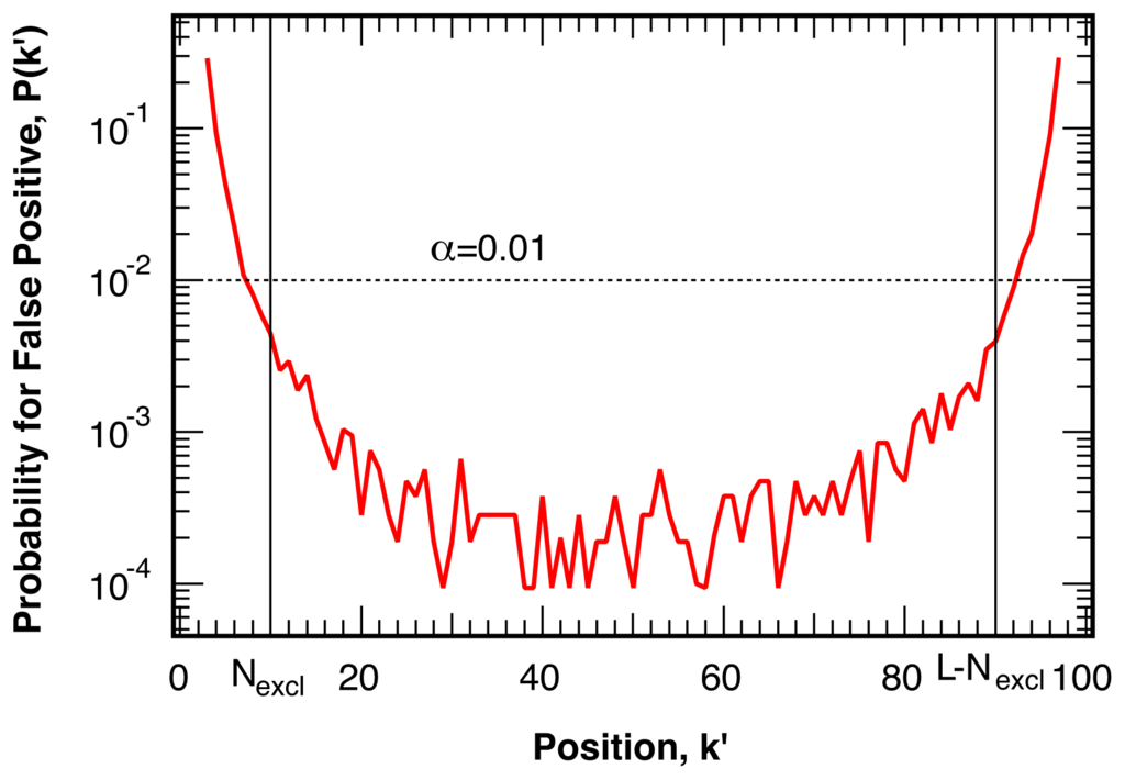 Trial break points, k′, near the beginning (k′ → 0) or the end (k′ → L) of the investigated sequence of the trajectory generate one section with a very small sample size. The resulting large fluctuations in the mean and standard deviation of this small section lead to an increased probability of false positive identification, as shown in Figure 3 for N = 100,000 simulations for sequences of length L = 100. The increased probability of false positives near one of the limits of the sequence does not depend on the length of the remainder of the sequence, L − k′. As this increased likelihood for the identification of false break points significantly exceeds the ideal, targeted, probability of α, as indicated by the dashed line in Figure 3, we exclude Nexcl = 10 points at the beginning and the end of the investigated sequence of intensity ratio points from the analysis.