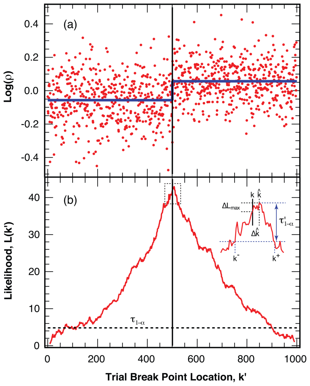 Furthermore, we determine the difference in the likelihood measure Δmax = max−(k) between the likelihood at the maximum, max = (k̂) and the likelihood for a break at the actual break point, (k). From the distribution of this likelihood difference, Δmax, we find a threshold value τ′1−α such that for a fraction 1−α of the N trials Δmax falls below τ′1−α where 1−α signifies the level of confidence for the location error estimate. We use this threshold value τ′1−α to find the confidence interval k− . . . k+ for the estimated break point k̂, where k− and k+ are the two points to the right and left of k̂, respectively, such that (k−) = (k+) = max − τ′1−α (see Figure 4).