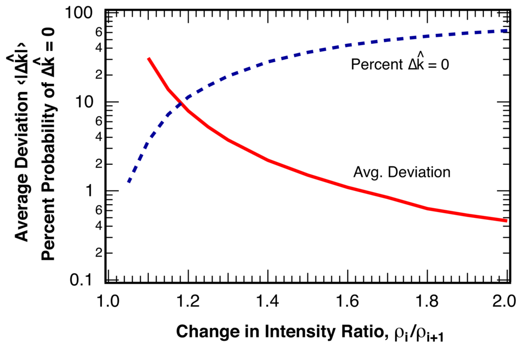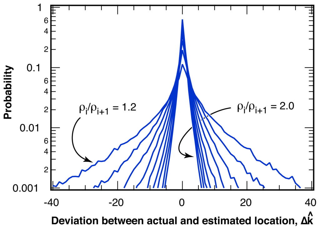 The distribution of the deviation, Δk̂ = k̂− k, of the estimated location for the intensity ratio break point, k̂, from the actual break point, k, is shown in Figure 5 for various changes in the intensity ratio, ρi/ρi+1. The probability P(Δ k̂) falls off approximately exponentially from a maximum probability at zero error, Δ k̂ = 0 and only depends on the change in the intensity ratio, ρi/ρi+1, at the break point, but not on the length of the sample, L, or on the relative location, k/L, of the break point within the sample. For sequences similar to the example pictured in Figure 4 with ρi/ρi+1 = 1.30 and ⟨Nphoton⟩ = 25 photons per bin, over 20% of all break points are identified without error, Δk̂ = 0. The average deviation of all identified break points is ⟨|Δk̂|⟩ = 3.7 bins. The average deviation, ⟨|Δk̂|⟩ is shown in Figure 6 as a function of the relative change in intensity ratio, ρi/ρi+1, for a bin size of ⟨Nphoton⟩ = 25 photons per bin. Also indicated in Figure 6 is the percentage of correctly identified break point locations, P(Δk̂ = 0).