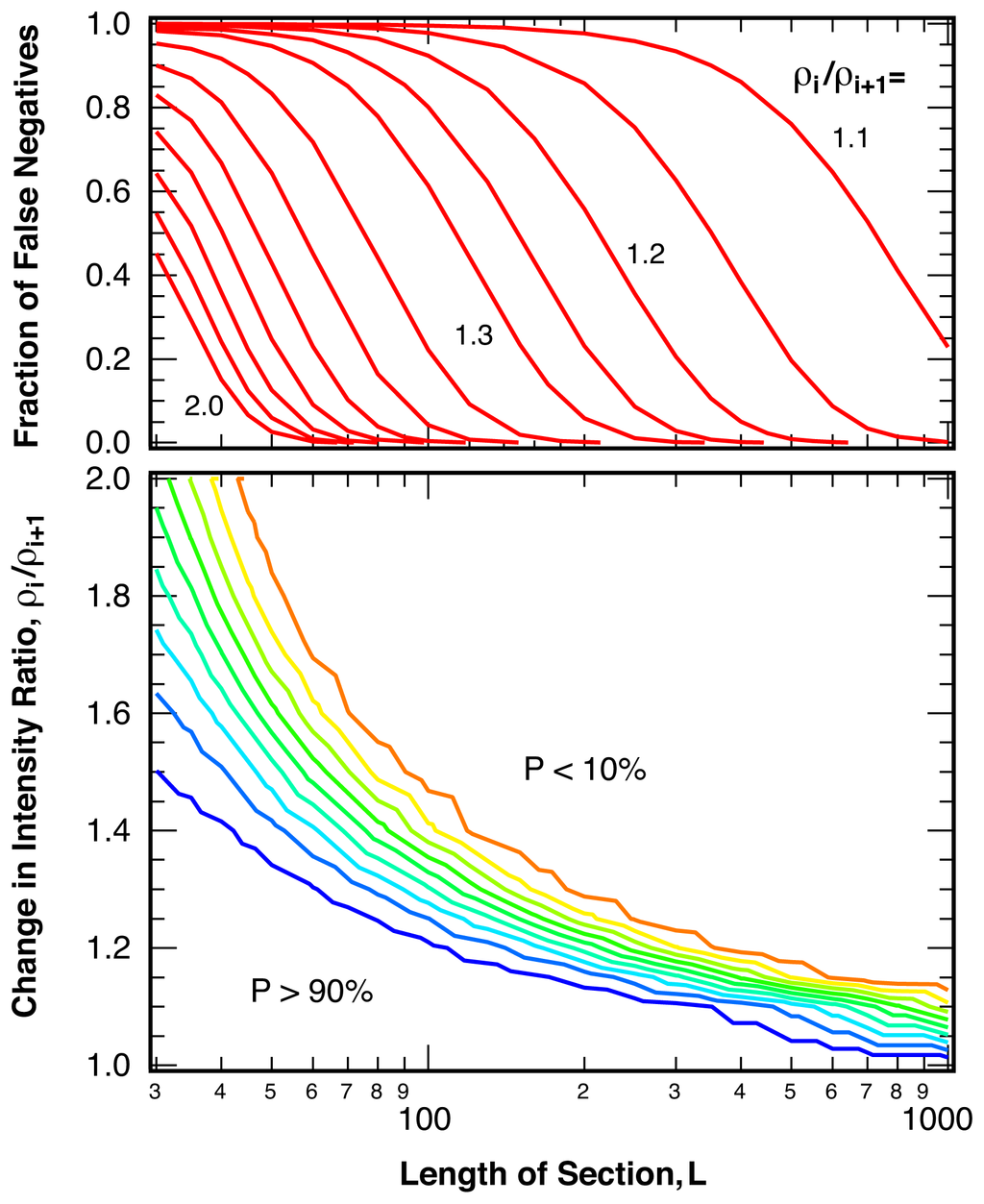 We determine the sensitivity of the analysis, that is the probability of false negatives, or break points missed, by testing the method described above on two types of sequences of simulated intensity ratio points. The first set of tests is performed on sequences that include a single break point at location k, the second set of tests uses simple model sequences with multiple break points (Njumps = 200) of identical spacing and constant changes in the intensity ratio (square waves). The probability of false negatives in sequences with a single break point depends strongly on the change in intensity ratio, ρi/ρi+1, the average number of photons per bin, ⟨Nphoton⟩, and the length of the investigated sequence, L. Figure 7 shows these dependences for a bin size of ⟨Nphoton⟩ = 25 photons per bin both as a contour plot and as cuts for a variety of intensity ratio changes. As expected, closely spaced break points with small changes in the intensity ratio are likely missed, but both closely spaced large jumps as well as well-separated small jumps can be detected reliably.