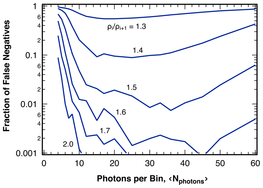 Fraction of undetected break points (false negatives) for various changes in the intensity ratio, ρi/ρi+1, as indicated, in sequences of photons with 2000 photons per break point as a function of the average bin size, ⟨Nphoton⟩, for 1 − α = 99% using the analysis algorithm invoking the additional safeguards discussed in the text.