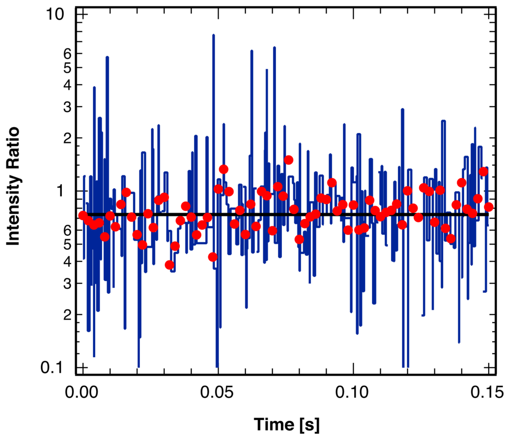 Ratio of the intensity of the two polarization components of the fluorescence from a single molecule embedded in a rigid polymer matrix, binned at 2 ms (red points). Result from the statistical analysis described in this paper (black line) indicating the expected lack of any reorientations of the probe molecule. Results from the separate identification of intensity break points in each polarization channel (blue line), frequently misidentifying blinking events as single molecule reorientations.