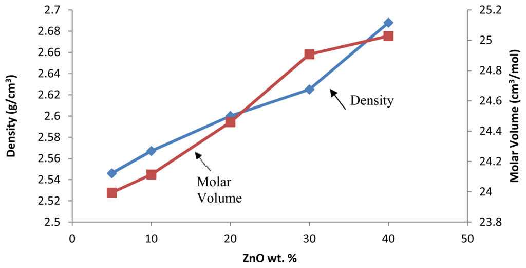 A plot of the density and molar volume of the glasses versus the weight percentage of ZnO is shown in Figure 1. Figure 1 shows that the density of the (ZnO)x(SLS)1 − x glass was increased with the addition of ZnO content. The increased density of the glasses is due to the heavier zinc atomic weight compared with the other elements in the glass samples. The atomic weight of zinc is 65.390, which is heavier than the atomic mass of Si (28.086), Ca (40.078) and Na (22.989). Increases in the density of the (ZnO)x(SLS)1 − x glass sample also result in changes in the crosslink density. The increases in the density of the glass samples are attributed to the formation of new linkages in the (ZnO)x(SLS)1 − x glass structure. The Zn2+ ion tends to occupy interstitial sites within the highly open glass network.