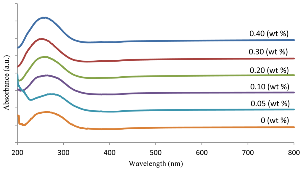 Absorption spectra of the SLS glasses containing ZnO are shown in Figure 2. It is clear that there is no sharp absorption edge that corresponds to the characteristics of the glassy state. Generally, the absorption edge of the glass samples is determined by the strength of the oxygen bonding in the glass network.