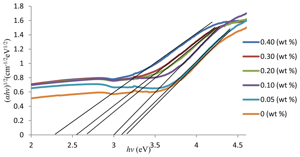 In this work, the absorption coefficients, A, was determined near the absorption edge of different photon energies for all glass samples using Equation (4). Therefore, the typical plot of (Ahv)1/2 versus photon energy (hv) for indirect allowed transitions that is used to determine the values of optical band gaps, Eopt, is shown in Figure 3. There is a linear dependence between (Ahv)1/2 and the photon energy. At the higher photon energies, the transitions occurring in the present glass samples were indirect. The indirect energy band gap is determined from the linear region of the plot and is shown in Figure 3. The results show that the indirect band gap values decrease from 3.20 to 2.32 eV with the increase in the ZnO content. These results suggest that the covalent nature of the glass matrix decreases with the increase in the ZnO content.