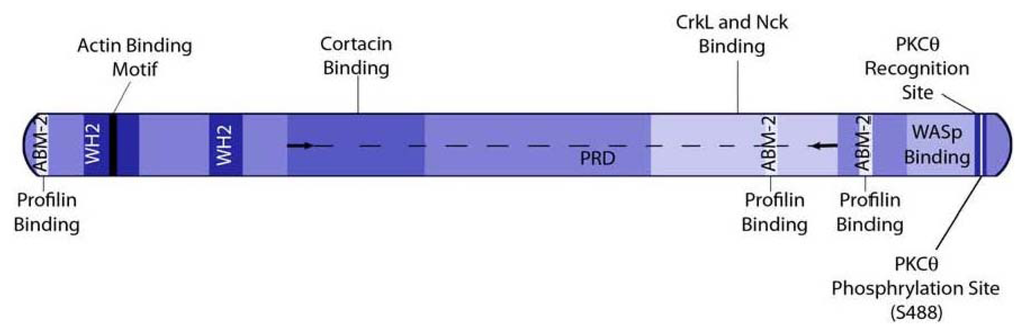 The central region of WIP is rich in proline residues, allowing it to bind Src homology 3 (SH3) containing proteins such as Nck1, CrkL, and cortactin. Nck is an adaptor protein that participates in the signaling cascade leading to actin polymerization in T cells [38–40]. WIP was found to interact with the second SH3 domain of Nck via a stretch of its proline rich domain (PRD), located at aa 321–415 [41]. This region of WIP also mediates the binding of the first SH3 domain of CrkL [42]. The binding of WIP to CrkL is responsible for the recruitment of the CrkL-WIP-WASp complex to the T cell-antigen presenting cell (APC) contact site, termed the immunological synapse (IS), following lymphocyte activation [42]. Cortactin is an NPF that activates Arp2/3, and thus enhances the formation of actin branches and the stabilization of actin filaments [43]. The interaction between WIP and cortactin is mediated by the fourth SH3 domain of cortactin and a stretch of the WIP PRD, located within the region of aa 136–205 [44]. Recently, it was shown that the interaction between WIP and cortactin is essential for the formation and maturation of actin-rich cellular protrusions, secretion of matrix degrading enzymes (matrix metalloproteinases, MMPs), and degradation of extracellular matrix (ECM) by murine dendritic cells [45].