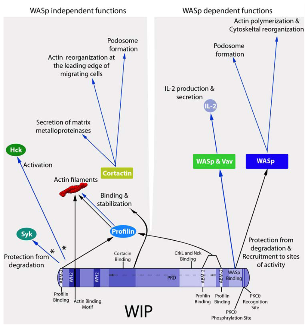 WIP interaction with its various binding partners, cooperating toward cellular functions. WIP interacts with various binding partners involved in multiple cellular processes, including actin polymerization, cytoskeletal rearrangement, migration and cellular activation. WIP was originally identified as a chaperone of WASp, protecting it from degradation and allowing it to promote actin polymerization and the rearrangement of the actin cytoskeleton. WIP is additionally responsible for recruiting WASp to its sites of activity. WASp and WIP also cooperate with Vav, inducing IL-2 production in activated T cells (right); In addition to the WASp-dependent functions of WIP, some roles of WIP rely on interactions with additional proteins. The PRD of WIP binds to cortactin, promoting actin reorganization, podosome formation and maturation, cellular migration and the secretion of matrix metalloproteinases. WIP also enhances actin stability by directly binding to actin filaments and to the actin sequestering protein, profilin. Other important binding partners of WIP are Hck, a Src family kinase involved in phagocytosis and monocyte activation, and Syk, a protein involved in mast cell signaling, protected from degradation by WIP (left). Black arrows indicate protein binding to WIP while blue arrows represent WIP dependent function. * The role of WASp in the interaction between WIP and these proteins has not yet been fully defined.