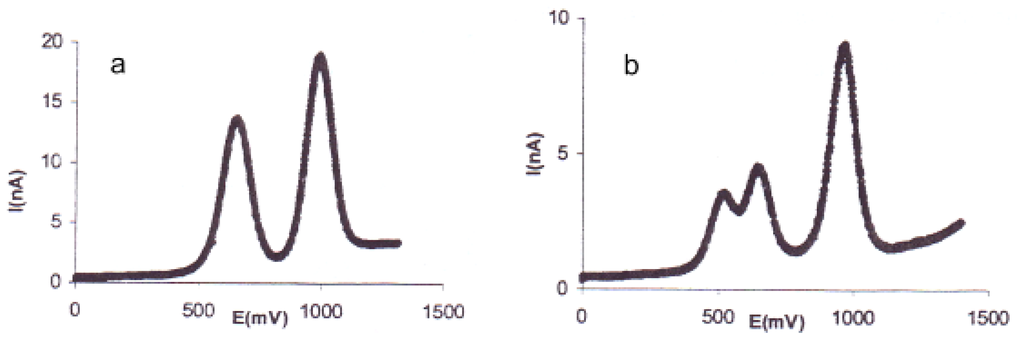The type I (a) SQW curve shows two sharp oxidation waves each with one electron process for the mono-TTF (Figure 1a). This kind of voltammogramm is observed for compounds 9, 10a and 10b. The type II (b) SQW curve is observed for compounds 11a,b, 12a,b, 13a,b and 14a,b (Figure 1b). We can clearly see three oxidation peaks with respectively a 1, 1 and 2 electron process. The real distinction of the two first oxidation waves is clearly due to the difference of the two TTF units of the bis-TTFs.