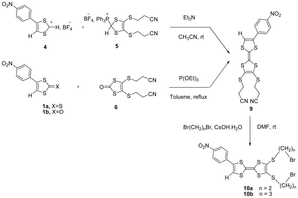The deprotection of bis(2-cyanoethyl) groups of 9 with the aid of CsOH and sequentially reaction with 10 equivalents of 1,2-dibromoethane or 1,3-dibromopropane afforded the unsymmetrically functionalized mono-TTF derivatives 2,3-bis(2-bromoethylthio)-6-p-nitrophenyl tetrathiafulvalene 10a or 2,3-bis(3-bromopropylthio)-6-p-nitrophenyl tetrathiafulvalene 10b in 45% and 44% yield, respectively after purification by column chromatography.