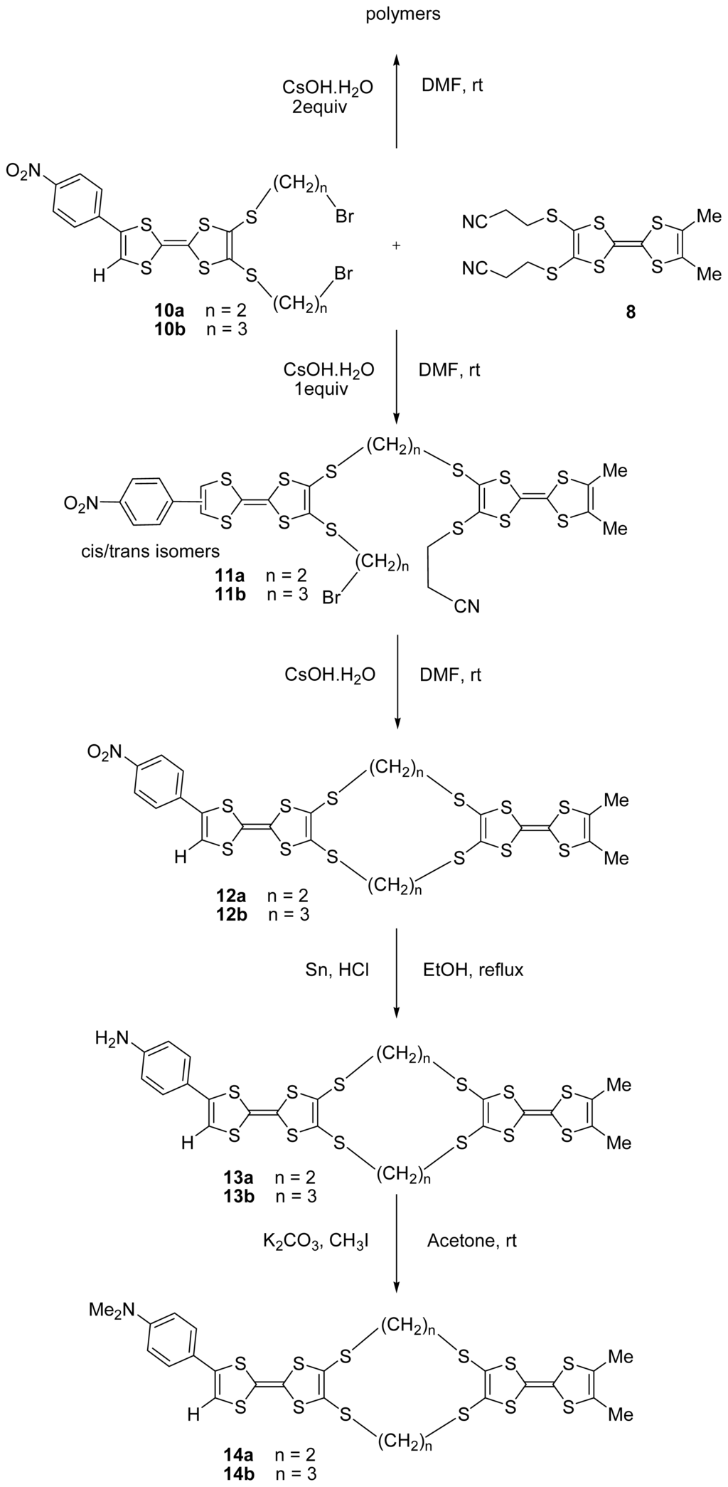The syntheses of bis-TTFs 11–14, also based on a multi-step procedure, were carried out as shown in Scheme 3. The electrodonors 11a and 11b containing two TTF units were obtained in a mixture of cis/trans isomers in 40% and 38% yield, respectively, by using the reaction of 10a or 10b with 2,3-bis(2-cyanoethylthio)-6,7-di(methyl)tetrathiafulvalene 8 [] using cesium hydroxide in DMF at room temperature. In this reaction, the risk of formation of a polymer is high, and to limit the polymerization it is necessary to work at high dilution (use a syringe pump). Thus, compounds 12a and 12b were obtained in 88% and 94% yield, respectively, by treatment of compounds 11a or 11b by cesium hydroxide in DMF at room temperature.