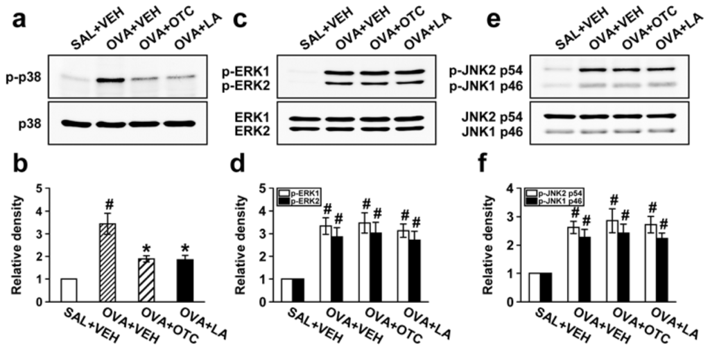 Effect of OTC or LA on phosphorylation of p38 mitogen-activated protein kinase (MAPK), extracellular signal-regulated kinase 1/2 (ERK1/2), and c-Jun N-terminal kinase (JNK) in lung tissues. Sampling was performed at 48 h after the last challenge in saline-inhaled mice administered drug vehicle (SAL + VEH), OVA-inhaled mice administered drug vehicle (OVA + VEH), OVA-inhaled mice administered OTC (OVA + OTC), and OVA-inhaled mice administered LA (OVA + LA). (a) Representative Western blotting of p-p38 MAPK and p38 MAPK in lung tissues; (b) Densitometric analyses are presented as the relative ratio of p-p38 MAPK to p38 MAPK; (c) Representative Western blotting of p-ERK1/2 and ERK1/2 in lung tissues; (d) Densitometric analyses are presented as the relative ratio of p-ERK1/2 to ERK1/2; (e) Representative Western blotting of p-JNK and JNK in lung tissues; (f) Densitometric analyses are presented as the relative ratio of p-JNK to JNK. The relative ratio of p-p38 MAPK (b), p-ERK1/2 (d), and JNK (f) in the lung tissues of SAL + VEH is arbitrarily presented as 1. Data represent mean ± SEM from 9 mice per group. # p < 0.05 versus SAL + VEH; * p < 0.05 versus OVA + VEH.