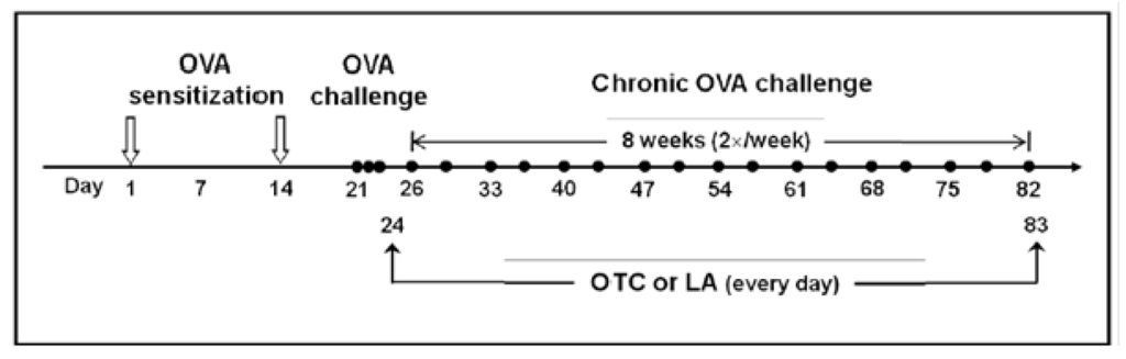 Schematic diagram of the experimental protocol. Mice were sensitized on days 1 and 14 by intraperitoneal injection of 20 μg OVA emulsified in 1 mg of aluminum hydroxide. On days 21, 22, and 23 after the initial sensitization, the mice were challenged for 30 min with an aerosol of 3% (weight/volume) OVA, and then repeated twice a week for 8 weeks beginning on day 26 with an aerosol of 1% (weight/volume) OVA in saline (or with saline as a control) using an ultrasonic nebulizer. In the case of treatment with OTC, it was administered intraperitoneally at 24-h intervals on days 24–83, beginning 4 days after the first challenge. In the case of treatment with LA, it was given by oral gavage at 24-h intervals on days 24–83, beginning 4 days after the first challenge.