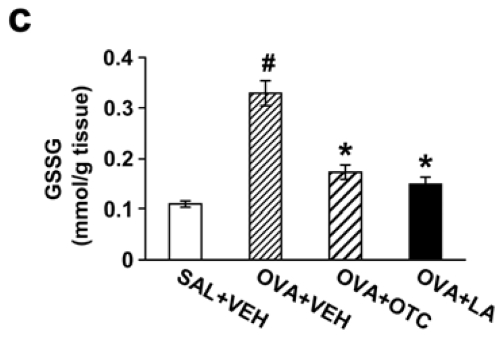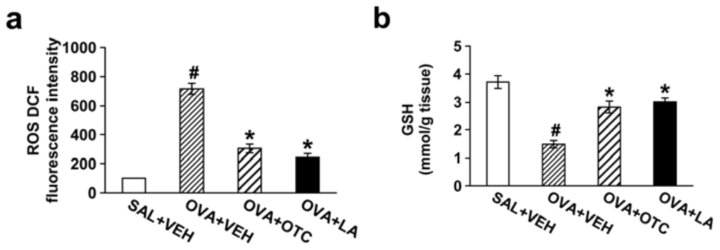 Chronic OVA-challenged mice displayed significantly lower GSH levels in lung tissues compared with the levels in the control mice (Figure 1b). The decrease in GSH levels was inhibited by administration of OTC or LA. In contrast, GSSG levels in lung tissues were increased after OVA inhalation and markedly decreased by treatment with OTC or LA (Figure 1c).