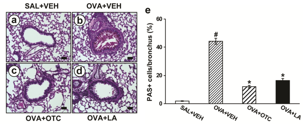 Effect of OTC or LA on airway mucus expression. Sampling was performed at 48 h after the last challenge in saline-inhaled mice administered drug vehicle (SAL + VEH), OVA-inhaled mice administered drug vehicle (OVA + VEH), OVA-inhaled mice administered OTC (OVA + OTC), and OVA-inhaled mice administered LA (OVA + LA). (a–d) Representative periodic acid-Schiff (PAS)-stained sections of the lungs from SAL + VEH (a); OVA + VEH (b); OVA + OTC (c); and OVA + LA (d); The red color indicates PAS-positive mucus expression. Bars indicate scale of 50 μm; (e) Quantitation of airway mucus expression. Data represent mean ± SEM from 9 mice per group. # p < 0.05 versus SAL + VEH; * p < 0.05 versus OVA + VEH.