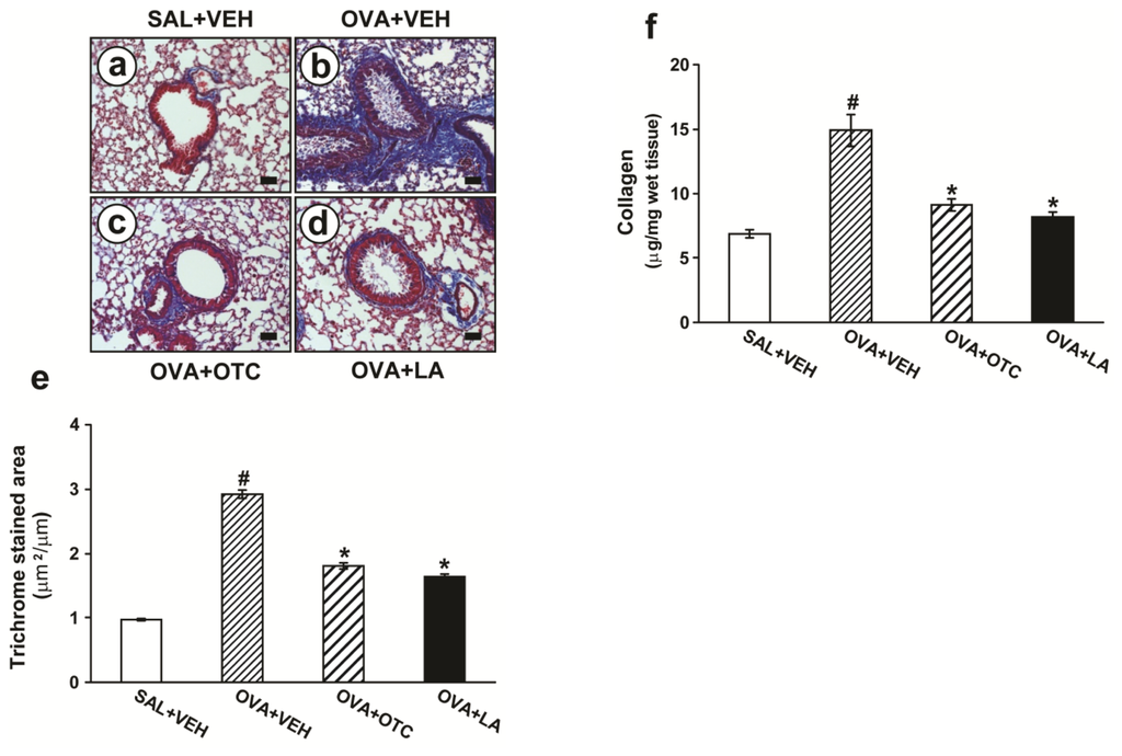Effects of OTC or LA on peribronchial fibrosis and total lung collagen content. Sampling was performed at 48 h after the last challenge in saline-inhaled mice administered drug vehicle (SAL + VEH), OVA-inhaled mice administered drug vehicle (OVA + VEH), OVA-inhaled mice administered OTC (OVA + OTC), and OVA-inhaled mice administered LA (OVA + LA). (a–d) Representative peribronchial and perivascular trichrome-stained sections of the lungs from SAL + VEH (a); OVA + VEH (b); OVA + OTC (c); and OVA + LA (d). The blue color indicates peribronchial trichrome-stained collagen deposition/fibrosis. Bars indicate scale of 50 μm; (e) Quantitation of peribronchial fibrosis. Results are expressed as the area of trichrome staining per micrometer length of basement membrane of bronchioles; (f) Total lung collagen content. The amount of lung collagen was measured using a collagen assay kit. Data represent mean ± SEM from 9 mice per group. # p < 0.05 versus SAL + VEH; * p < 0.05 versus OVA + VEH.