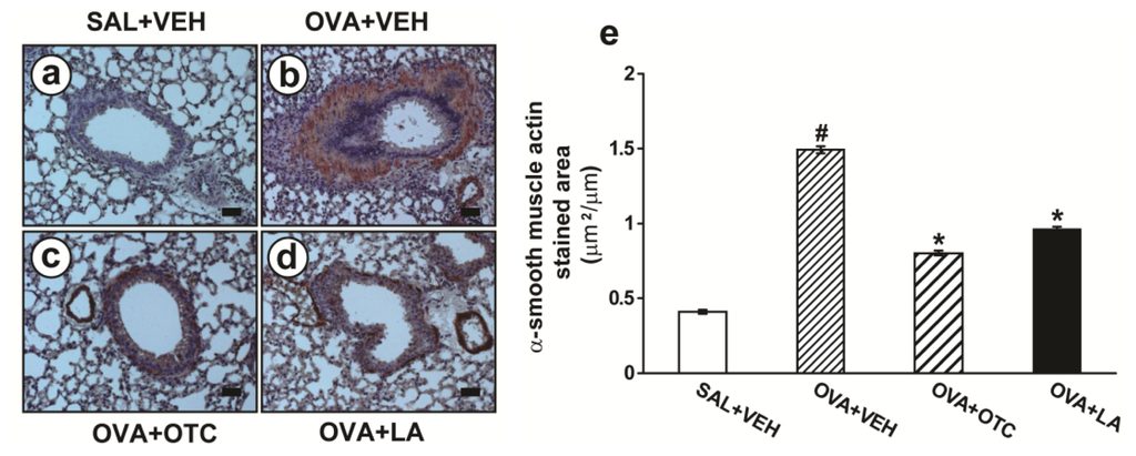 Effects of OTC or LA on airway smooth muscle hyperplasia. Sampling was performed at 48 h after the last challenge in saline-inhaled mice administered drug vehicle (SAL + VEH), OVA-inhaled mice administered drug vehicle (OVA + VEH), OVA-inhaled mice administered OTC (OVA + OTC), and OVA-inhaled mice administered LA (OVA + LA). (a–d) Representative immunohistochemical-stained sections for α-smooth muscle actin of the lungs from SAL + VEH (a); OVA + VEH (b); OVA + OTC (c); and OVA + LA (d); Bars indicate scale of 50 μm. (e) The area of peribornchial α-smooth muscle actin immunostaining. Results are expressed as the area of α-smooth muscle actin immunostaining per micrometer length of basement membrane of bronchioles. Data represent mean ± SEM from 9 mice per group. # p < 0.05 versus SAL + VEH; * p < 0.05 versus OVA + VEH.