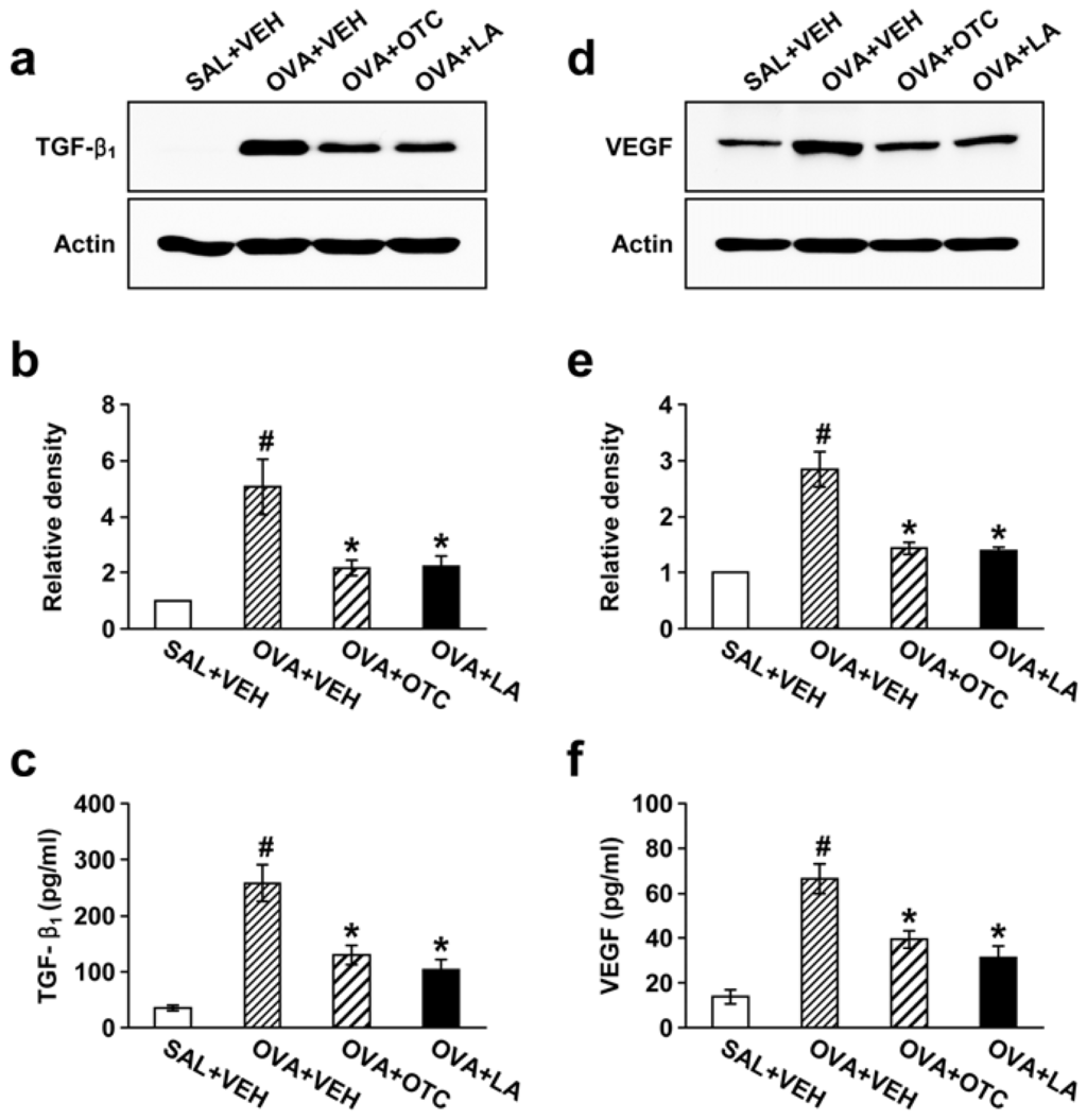 Effect of OTC or LA on the expression of TGF-β1 and vascular endothelial growth factor (VEGF) in lung tissues and in BAL fluids. Sampling was performed at 48 h after the last challenge in saline-inhaled mice administered drug vehicle (SAL + VEH), OVA-inhaled mice administered drug vehicle (OVA + VEH), OVA-inhaled mice administered OTC (OVA + OTC), and OVA-inhaled mice administered LA (OVA + LA). (a) Representative Western blotting of TGF-β1; (b) Densitometric analyses are presented as the relative ratio of TGF-β1 to actin. The relative ratio of TGF-β1 in the lung tissues of SAL + VEH is arbitrarily presented as 1; (c) Enzyme immunoassay of TGF-β1 in BAL fluids; (d) Representative Western blotting of VEGF in lung tissues; (e) Densitometric analyses are presented as the relative ratio of VEGF to actin. The relative ratio of VEGF in the lung tissues of SAL + VEH is arbitrarily presented as 1; (f) Enzyme immunoassay of VEGF in BAL fluids. Data represent mean ± SEM from 9 mice per group. # p < 0.05 versus SAL + VEH; * p < 0.05 versus OVA + VEH.